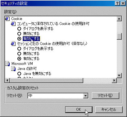 Cookie の使用許可」 - 「有効にする」 を選択し、[OK]